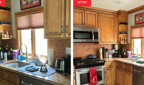 Step one: declutter surfaces. Clear tables, sideboards, nightstands, and counters. Remove everything, then only put back what truly belongs there.